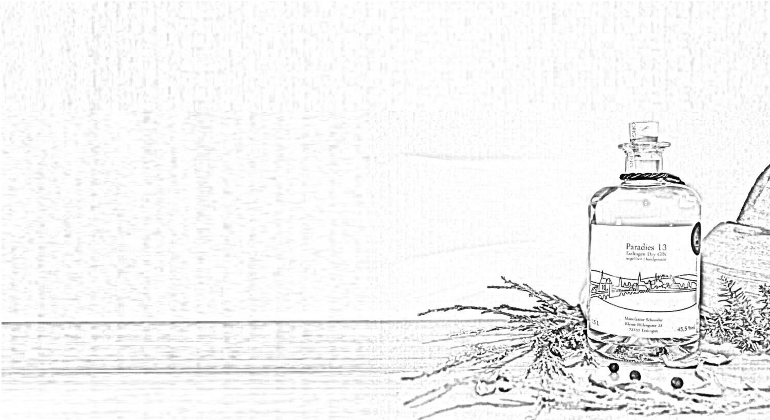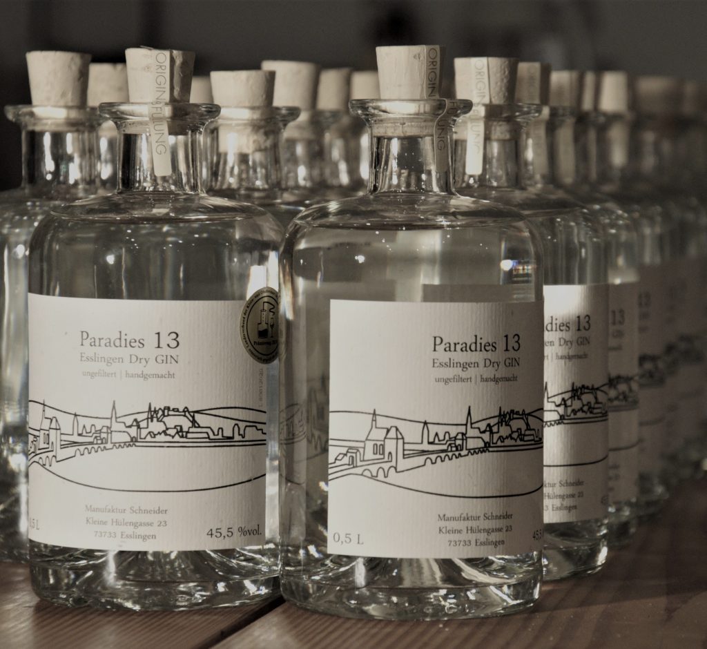 Wir stellen für unsere Heimatstadt Esslingen den GIN Paradies 13, den ersten Esslinger GIN her. Der GIN ist als regionales Produkt für Esslingen in Esslingen hergestellt. Wie bei einer Manufaktur üblich werden alle Produkte in Handarbeit, mit Liebe zum Genuss und in kleinen Chargen erzeugt. Diese Details sind in den Produkten erlebbar.